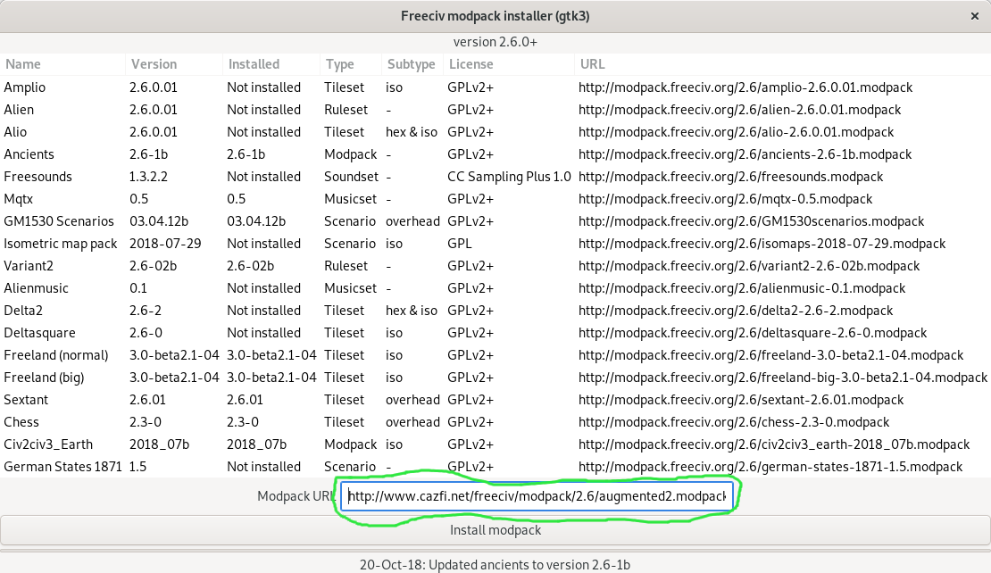 I'm making .modpack file for being able to install this modpack with the modpack installer. Current version is at http://www.cazfi.net/freeciv/modpack/2. ... d2.modpack and it installs the rulesets and augmentedi tileset, but not (fully) small augmentedis tileset. Once ready, it would good if it went to your git repo and would be maintained there with the rest of the modpack (and available for the modpack installer via the raw.githubusercontent.com URL)