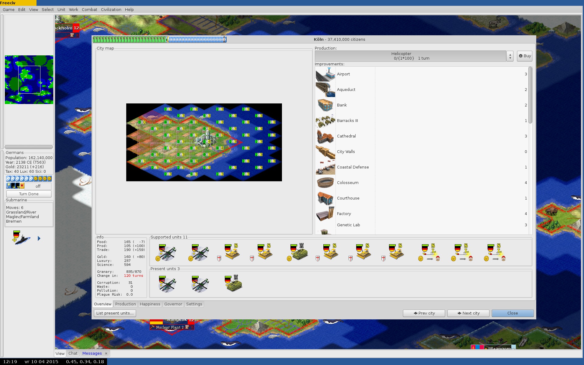 Anyways, rainbowrobin, in the experimental ruleset, cities can get a maximum city radius of four tiles (as you can see in the bottom screenshot), which allows for far bigger cities and far higher production and trade per city. Larger cities also have additional unit build slots so you can use all that production. Additionally, there's the Genetic Lab, which increases the food output by 25% if the city is greater than size 20, allowing for a hell of a city.