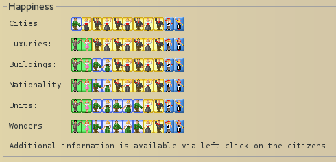 1. Cities: My empire is so big that I have penalty of 1 additional unhappy citizen in each city, so having 4 - 1 = 3 content citizens (of which 2 are turned to entertainers, so just one content worker)