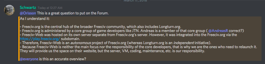 A question has been raised inside the New Freeciv-Web server on Discord about the relations between Freeciv.org, Freeciv-Web and Longturn.org. This was what I wrote in reply, it would be great if the broader community could confirm or correct: