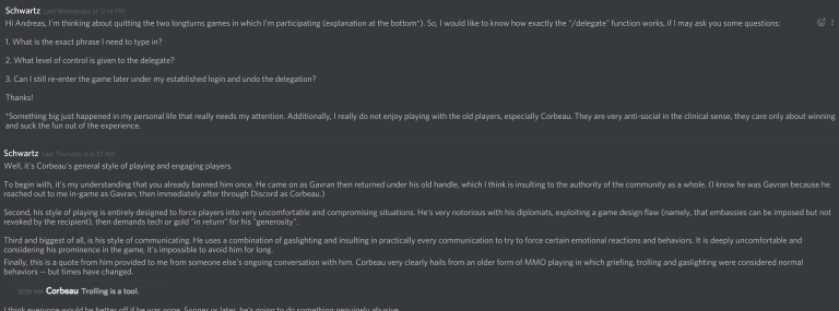 For the record, I am also attaching the relevant parts of log of private conversation between Schwartz and me so that everybody can inspect how abusive, trolling and insulting I've been toward him. I removed some OOC parts, you can take my word for it and believe they don't shed any new light on this, or you can ask Schwartz to publish them, I'm fine with publishing my part. Yes, I also made screenshots. With so much paranoid delusions in the air, better to be safe than sorry. Although, since I'm mentioning it, screenshots can also be faked, so, no reason to believe anything, right? RIGHT?