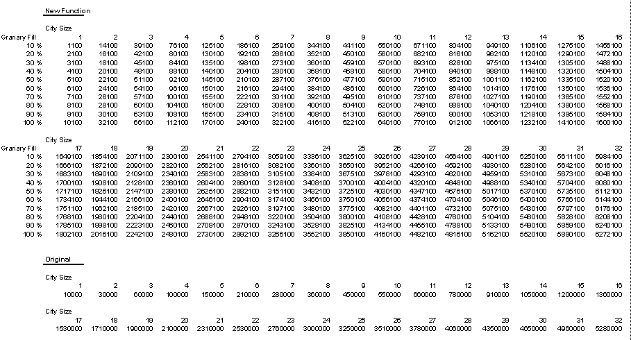 EDIT: Fixed previously miscalculated table and added +100 into function to prevent population count 0 with City Size 1 and empty granary.