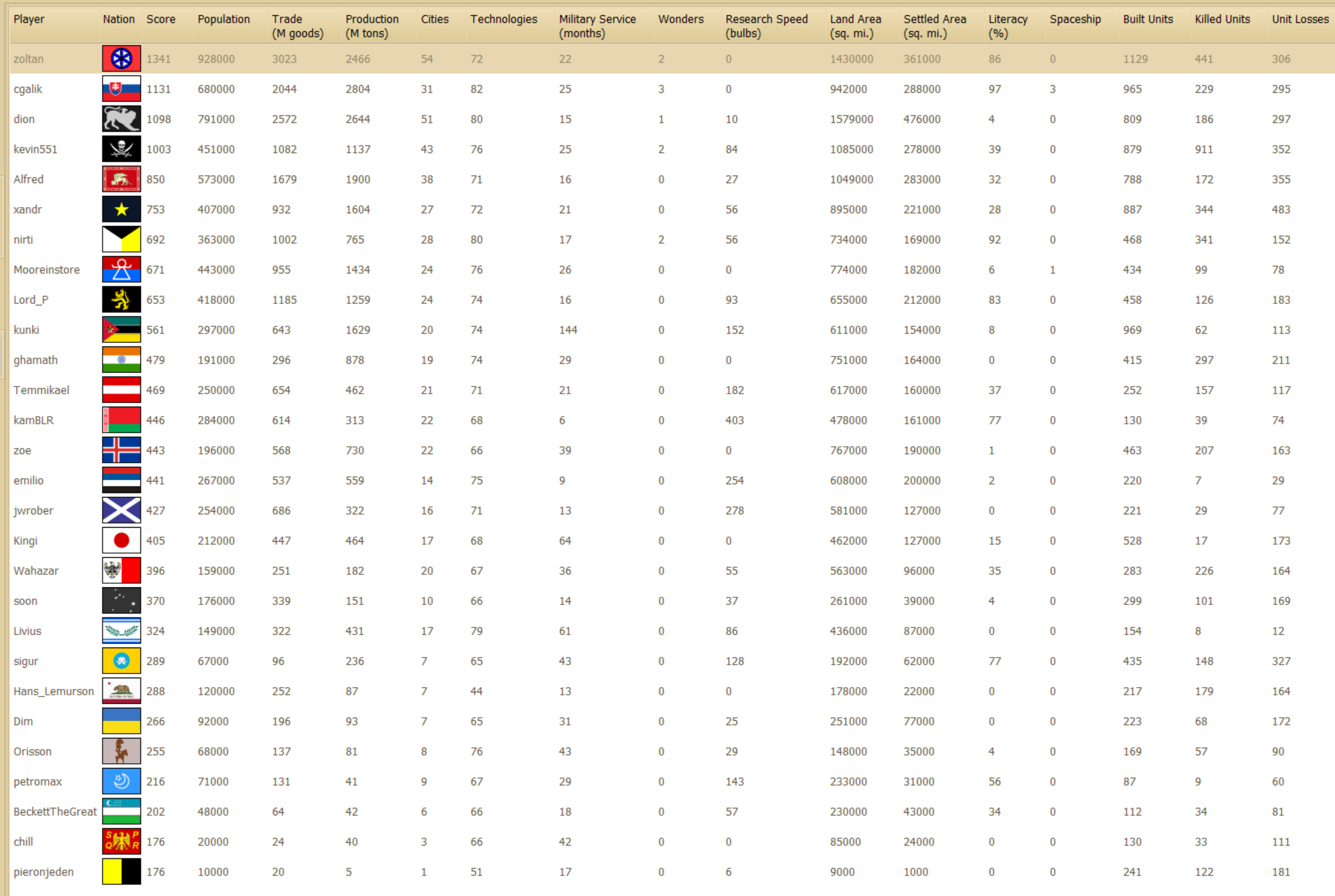 Here's the final scores, winning spaceship and a snapshot of my cap protected by Stealth Fighters. More info on forum.longturn.org / forum.longturn.net
