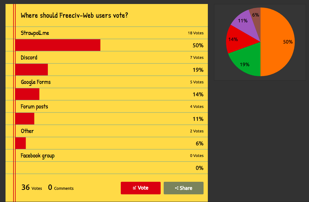 So, it would be awesome if the Working Group inside the New Freeciv-Web server on Discord could devise a way to conduct polls here in the Forum, even if it is just by embedding Strawpoll.