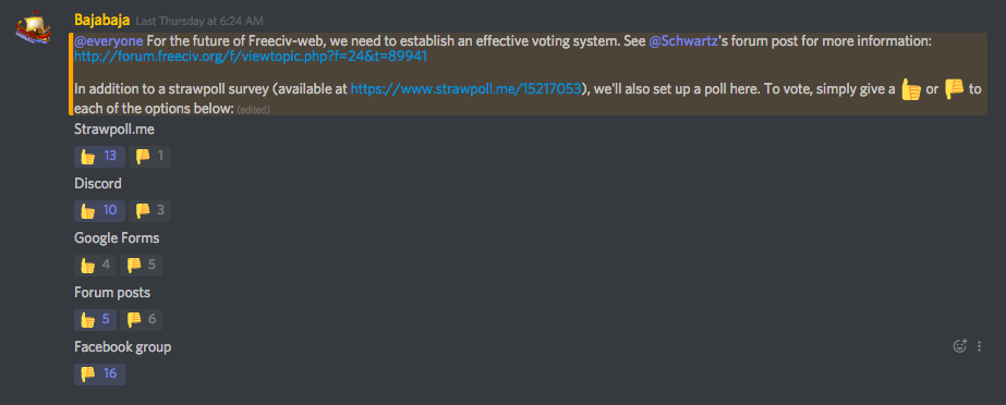 Personally, I think Corbeau and Arbogast are absolutely right, the Forum should be the center for community life and hence also for polling (and I voted that way). Discord is not for everybody, especially those who prefer (in the apt description of Mooreinstore) a "chess-like" Freeciv experience.